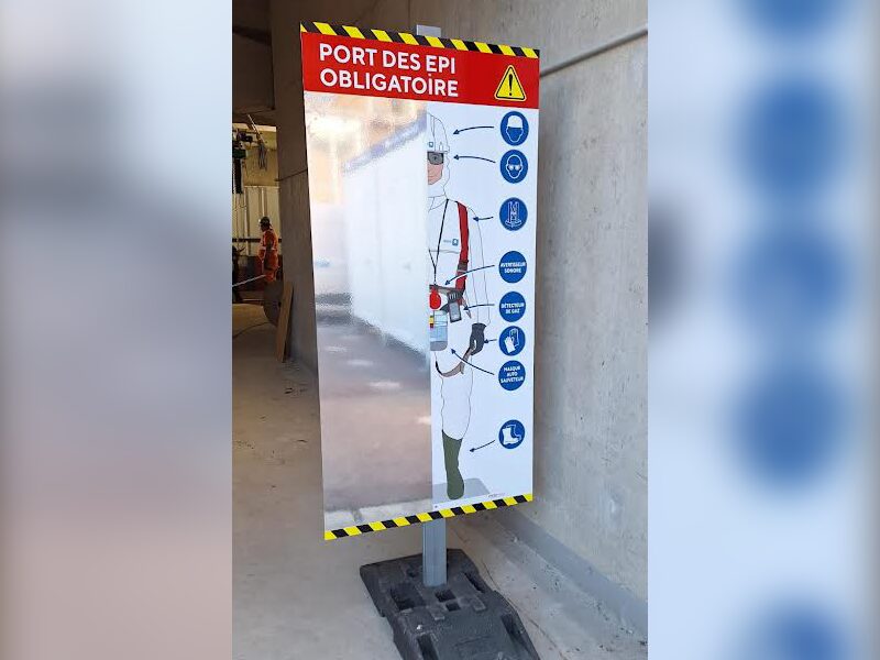 Création par Com’un Panneau d’un panneau port des EPI obligatoires avec zone miroir vinyle, pour les chantiers de l’entreprise DPSM, spécialisée dans la réalisation de réseaux d’eau, en Haute-Garonne (31).